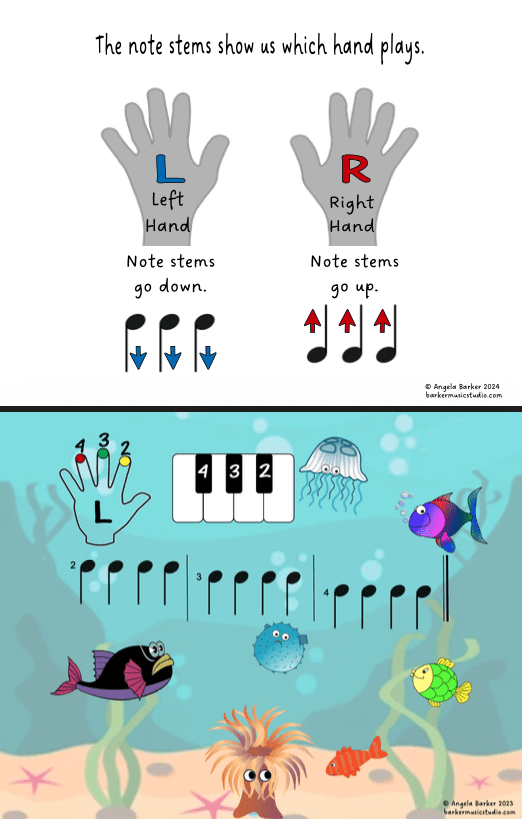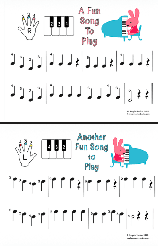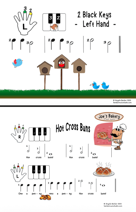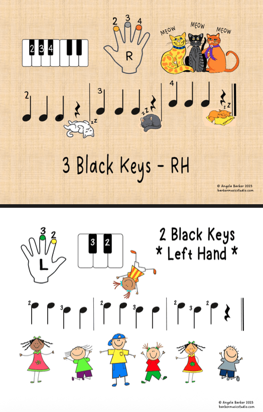 Simple exercises and songs to play on the black keys that use left- or right- hand fingers 2, 3, and 4. Note values include quarter notes, quarter rests, and half notes. Downloadable pages: 13.